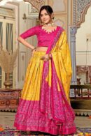 Step into timeless tradition with this beautifully crafted Tussar Silk Lehenga Set. Designed with exquisite Patola print and accented with shimmering foil work, this stitched lehenga offers a flattering silhouette with a 3.80-meter flair and supportive waist fit up to 42 inches. Enhanced with canvas, can-can, and finished with a drawstring, zip, and heavy tassels for added charm.